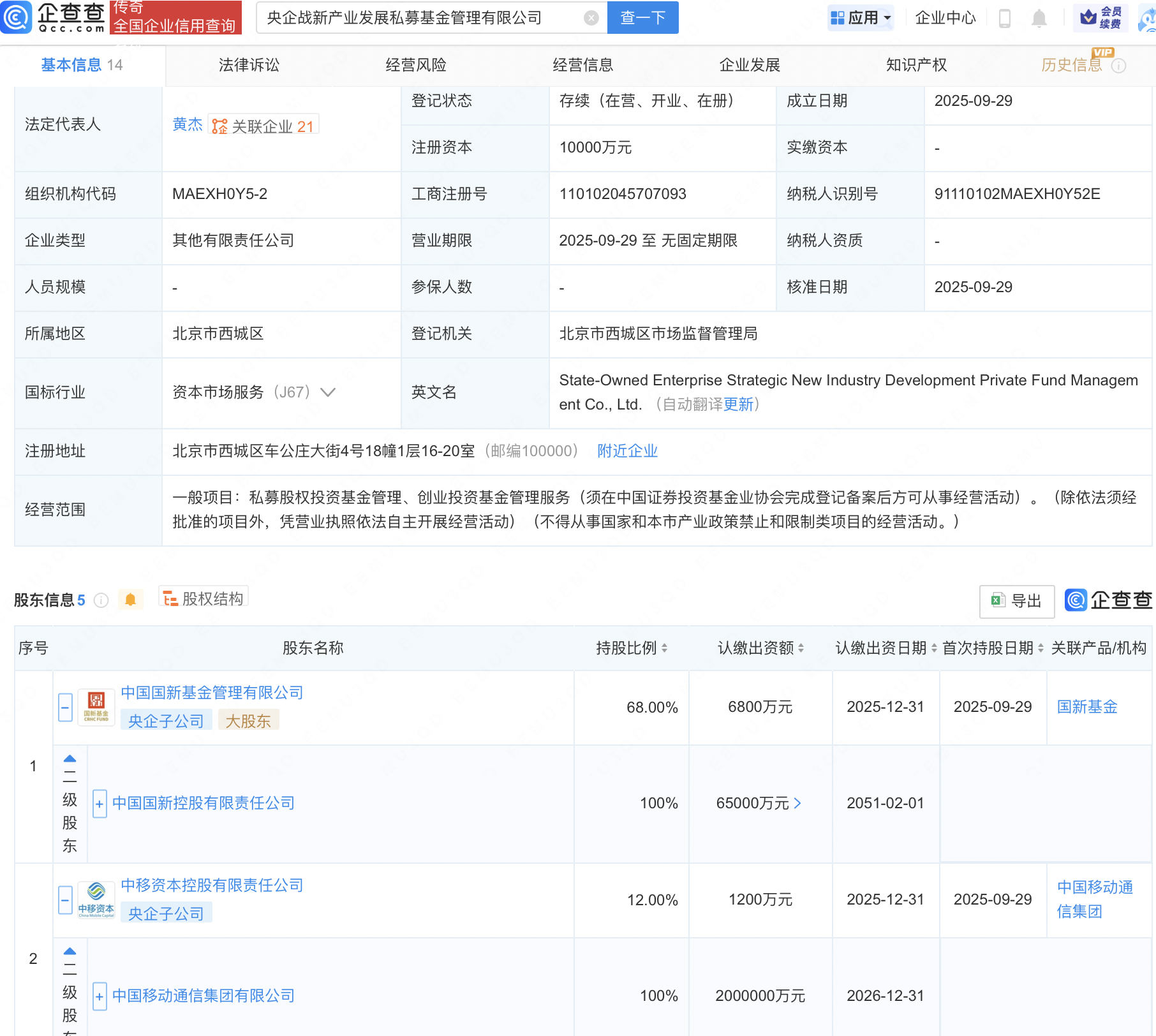 近日股票配资门户导航查询,央企战新产业发展私募基金管理有限公司成立,注册资本1亿元,经营范围包含:私募股权投资基金管理、创业投资基金管理服务。企查查股权穿透显示,该公司由中国国新控股有限责任公司全资子公司中国国新基金管理有限公司、中国移动通信集团有限公司全资子公司中移资本控股有限责任公司、中国石化集团资本有限公司等共同持股。